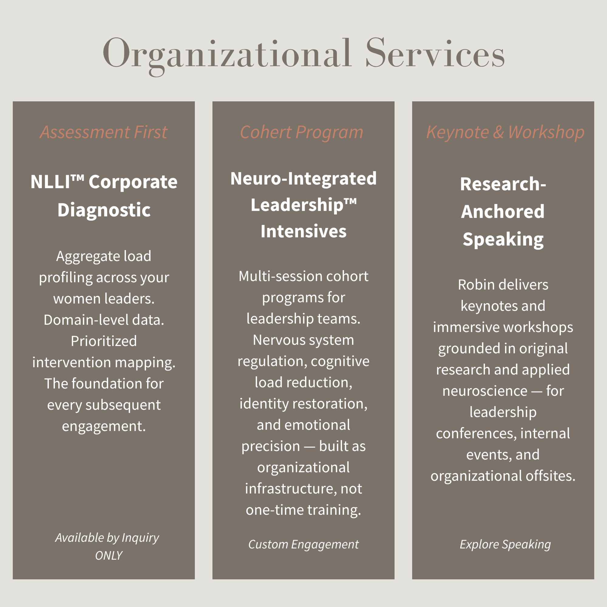 When a high-capacity woman leader is running on a chronically dysregulated nervous system, the cost appears as decreased decision quality, communication breakdown, reduced innovation, and eventual attrition. The NLLI™ quantifies this — in data your leadership team can act on.